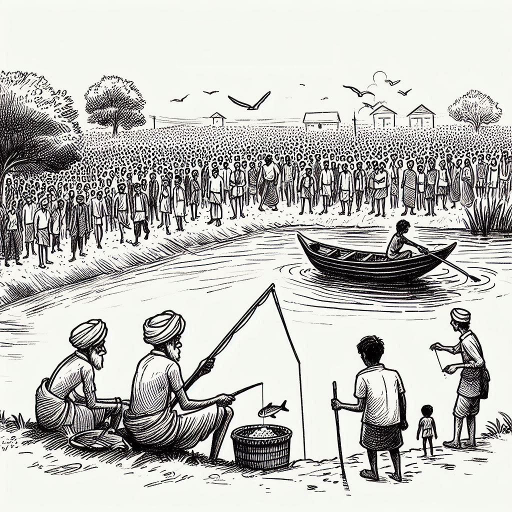 ढलुवामा माछा मार्दै गर्दा नाथुरामले पिप्राहा जाने डगरमा मान्छेको ताँती देख्यो । कमिलाको ताँतीजस्तो । धमिराको लस्करजस्तो । भेडाको बथानजस्तो । ऊ एकछिन अलमलमा पर्यो । अघिल्लो राति गाउँमा अकबरे हात्तीको बथान पसेको थियो । त्यसैले कतै बित्यास पो पार्यो कि ? अनिष्टको आशाले उसको मनमा थोरै चिसो बतास चल्यो ।