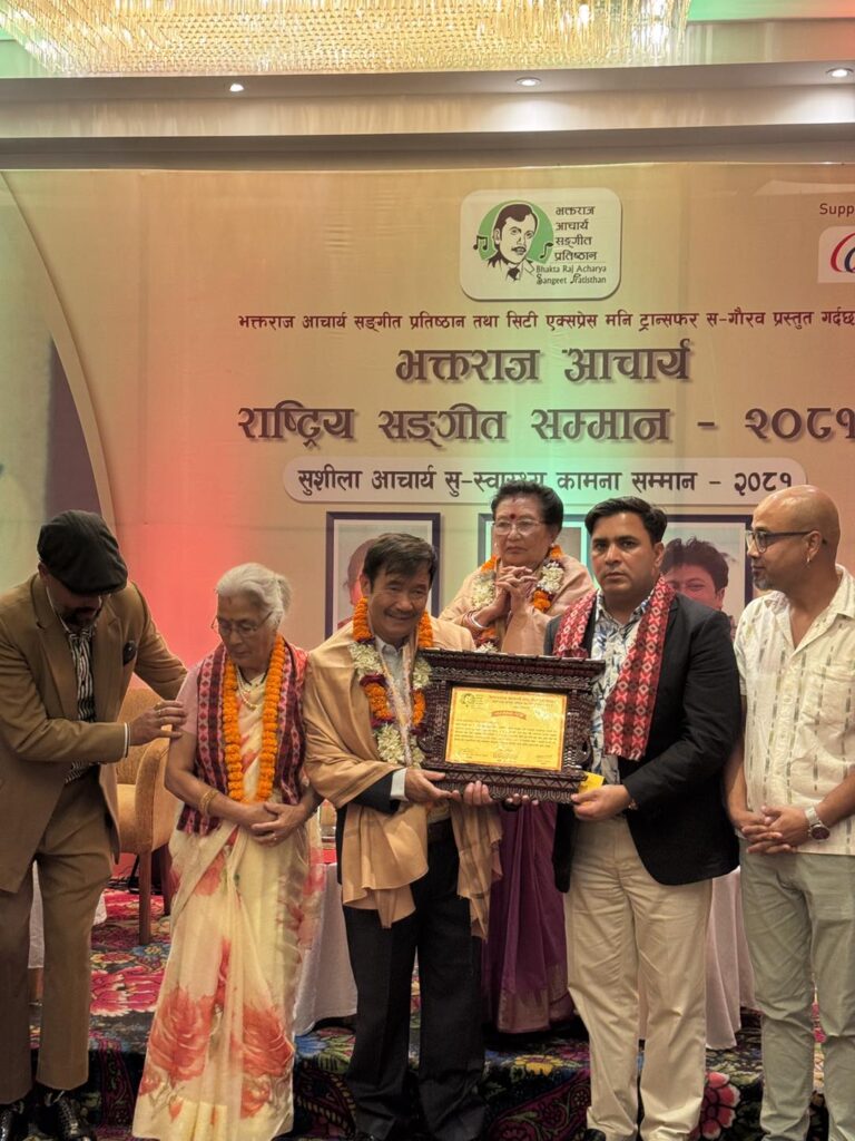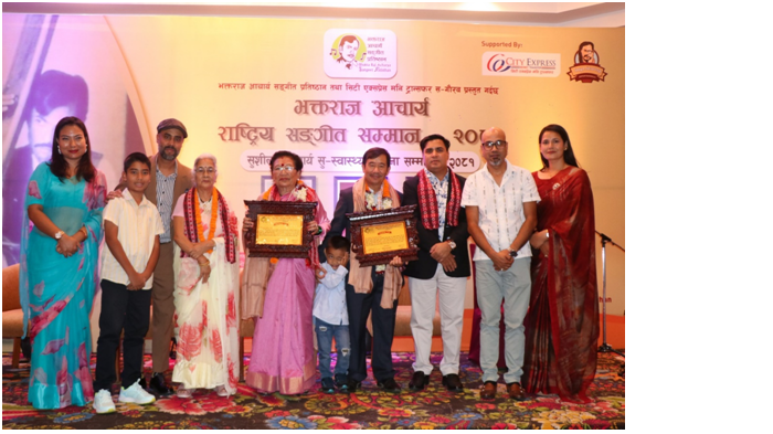 सिटी एक्सप्रेस र भक्तराज आचार्य संगीत प्रतिष्ठानको संयुक्त सहकार्यमा ‘भक्तराज आचार्य राष्ट्रिय संगीत सम्मान २०८१’ प्रदान गरिएको छ । शनिबार कुपन्डोलस्थित होटेल हिमालयमा गायनतर्फ वरिष्ठ गायिका चन्द्रकला शाह र संगीततर्फ वरिष्ठ संगीतकार शीलाबहादुर मोक्तानलाई जनही नगद पुरस्कार एक लाख रुपैयाँ प्रदान गरिएको हो ।