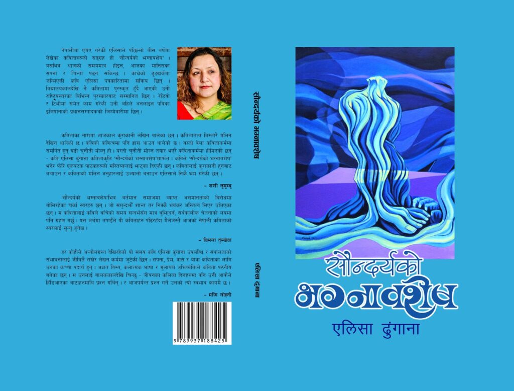 कवि तथा सञ्चारकर्मी एलिसा ढुंगानाको कविता संग्रह ‘सौन्दर्यको भग्नावशेष’ बजारमा आएको छ । वरिष्ठ कवि तथा गीतकार दिनेश अधिकारीले आज काठमाडौंमा आयोजित कार्यक्रममा सौन्दर्यको भग्नावशेषको विमोचन गर्नुभयो ।