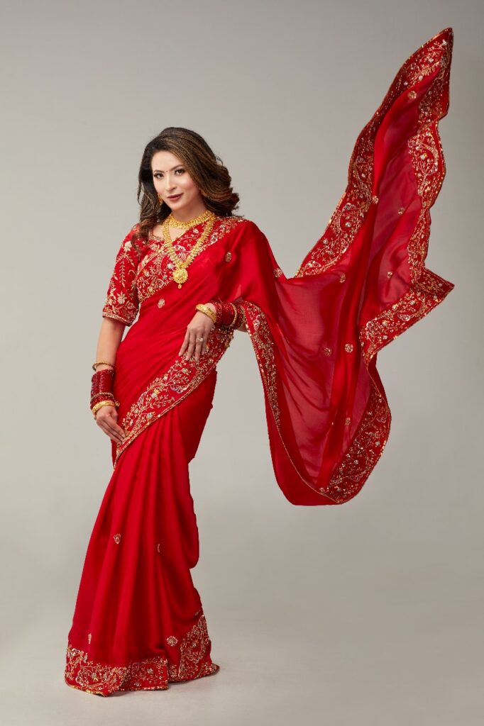 बेहुलीको पहिरन अरूभन्दा भव्य, भिन्न र आकर्षक देखिनु आवश्यक छ । यो सिल्क सारी विशेष रूपमा बेहुलीका लागि तयार पारिएको छ, जसमा सुनौलो, चाँदीको र मोतीजडित कलात्मक ह्यान्ड वर्क गरिएको छ । मेटालिक जरदोजी, सिकोइन्स, मोती र क्रिस्टलको संयोजनले यो सारीलाई अझै विलासी बनाएको छ ।
