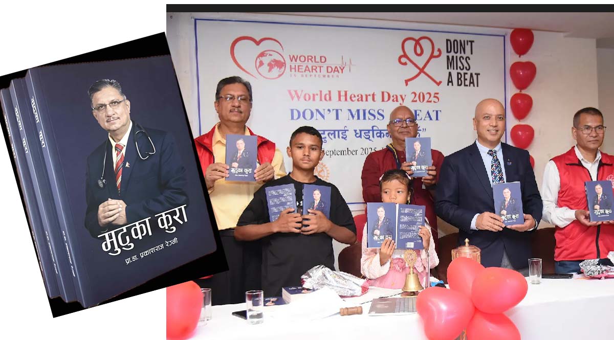बरिष्ठ मुटुरोग विशेषज्ञ प्रा. डा. प्रकाशराज रेग्मी लिखित ‘मुटुका कुरा’ पुस्तक विमोचन गरिएको छ। विश्व मुटु दिवसको अवसर पारेर नेपाल एनसीडी एलायन्स र रोटरी क्लब अफ पाटनको संयुक्त आयोजनामा बिहीबार विशेष समारोह गरी पुस्तक सार्वजनिक गरिएको हो। पुस्तकको विमोचन ओपन हार्ट सर्जरीबाट स्वस्थ भएका दुई बालबालिका—विशाल गजमेर र कल्पना तामाङ—को हातबाट गरिएको थियो। समारोहमा बोल्दै…
