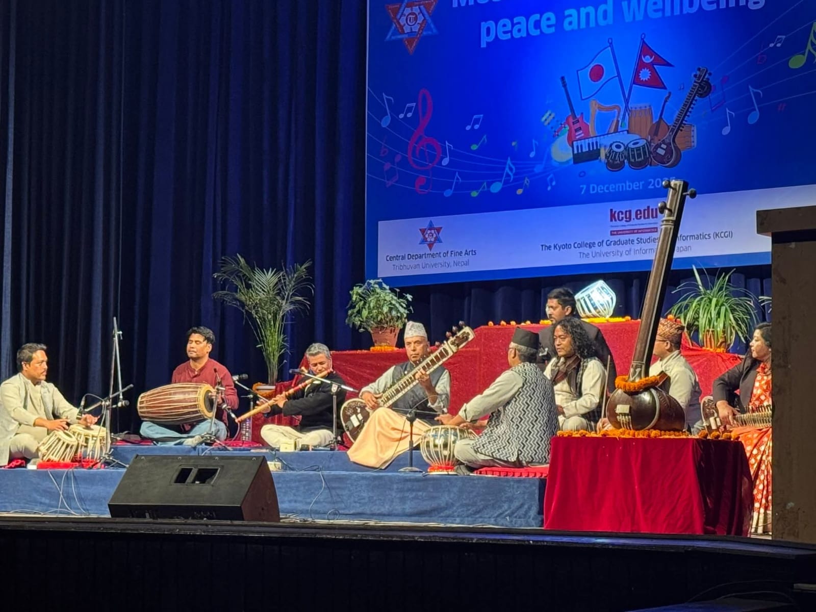 गत मंसिर २१ का दिन जमलस्थित राष्ट्रिय नाचघरको प्रेक्षालय उत्सवमय बन्यो । कारण, त्रिभुवन विश्वविद्यालय ललितकला केन्द्रीय विभाग तथा जापानस्थित क्योटो कलेज अफ ग्य्राजुएट स्टडिज फर इन्फम्र्याटिक्स (केसिजिआई) को सांस्कृतिक सहकार्यमा नेपालका दुई दर्जन बढी गायक तथा वाद्यवादकहरूले ‘शान्ति तथा आरोग्यनिम्ति साङ्गीतिक सहकार्य’ शीर्षकमा गायन तथा वाद्यवादनमार्फत प्रेक्षालयमा खचाखच दर्शकलाई आफ्ना प्रस्तुतिमार्फत मन्त्रमुग्ध पारेका थिए । बहुविधागत साङ्गीतिक उत्सवमा ललितकला विभागका अध्यापक एवम् विद्यार्थीहरूलाई व्यावसायिक गायक एवं वाद्यवादकहरूले साथ दिएका थिए ।