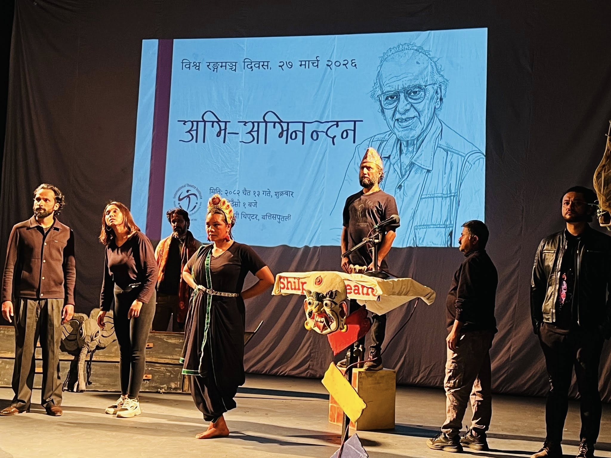 शुक्रबार शिल्पी थिएटर को मञ्चमा विशेष दृश्य देखियो—अभि सुवेदी का नाटकका पात्रहरू आफैं उपस्थित भएर आफ्नै सर्जकलाई अभिनन्दन गर्न उभिए।